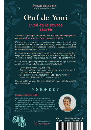 L’œuf de Yoni est souvent perçu uniquement comme un exercice qui tonifie les muscles du périnée mais il s’agit avant tout d’une pratique ancestrale qui reconnecte la femme à son corps, son intimité et sa sexualité en pleine conscience. Cet ouvrage vous accompagne sur ce chemin intérieur, énergétique et spirituel. Il vous guide à harmoniser entre eux les 4 premiers chakras, et à initier si besoin, un processus de guérison et de transformation. Il vous invite à plus de présence en vous-même, et à plus d’amour de soi, tout en répondant à vos questions techniques :