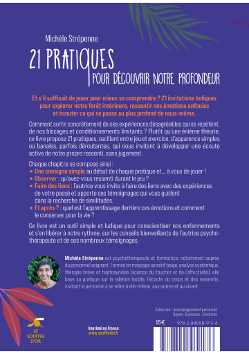 Plutôt qu'une énième théorie, ce livre propose 21 pratiques, oscillant entre jeu et exercice, d'apparence simples ou banales, parfois déroutantes, qui nous invitent à développer une écoute active de notre propre ressenti, sans jugements. Changeons de point de vue sur nous-même, remettons du mouvement dans nos habitudes, accueillons nos zones d'ombre... Apprenons à distinguer nos résistances au changement, de nos émotions, de nos jugements, de nos croyances. Et s'il suffisait de jouer pour mieux se comprendre ? 21 invitations ludiques pour explorer notre forêt intérieure, ressentir nos émotions enfouies et écouter ce qui se passe au plus profond de nous-même.