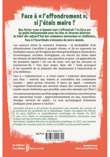 Les auteurs tirent la sonnette d'alarme : la probabilité d’un effondrement s'accélère à grande vitesse, et ils en exposent les multiples causes. Qu’il s’agisse de crises géopolitiques, financières, économiques, sociales, écologiques, ou encore du chaos dans les réseaux de distribution, une question se pose : où apparaîtront les premiers signes ? En cas de crise, vers qui les citoyens se tourneront-ils ? Vers leur maire, bien sûr ! Voilà pourquoi il est essentiel de se préparer dès maintenant à l’autonomie et à la résilience.