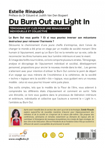 Du Burn Out au Light In est le cheminement d’une jeune chef d’entreprise dont l’envie de changer le monde a été prise en otage par un modèle de société menant l’être humain à l’épuisement avant qu’un Burn Out grave ne la remette sur sa voie, celle de reconnecter les êtres humains avec leur lumière intérieure et avec le vivant. Un livre ô combien d’actualité qui vous mènera de l’incohérence à la cohérence, de la société "techno" logique vers la société "bio" logique, vous guidant vers un nouveau paradigme : celui où vous pourrez trouver votre juste place.
