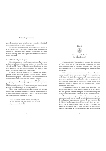 L’auteure a répertorié pour nous une quarantaine de ces perles qu’elle a regroupées en sept grands thèmes : l’infini possible, trouver les cadeaux, l’acceptation de ce qui est, l’écoute de soi, la communication, la parentalité et le lien parent-enfant, le plaisir, l’humour et la légèreté. Un véritable petit trésor !
