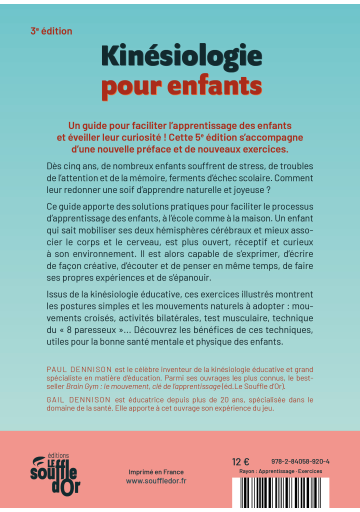 Ce guide apporte des solutions pratiques pour faciliter le processus d’apprentissage des enfants, à l’école comme à la maison. Un enfant qui sait mobiliser ses deux hémisphères cérébraux et mieux associer le corps et le cerveau, est plus ouvert, réceptif et curieux à son environnement. Il est alors capable de s’exprimer, d’écrire de façon créative, d’écouter et de penser en même temps, de faire ses propres expériences et de s’épanouir. Issus de la kinésiologie éducative, ces exercices illustrés montrent les postures simples et les mouvements naturels à adopter : mouvements croisés, activités bilatérales, test musculaire, technique du « 8 paresseux »...
